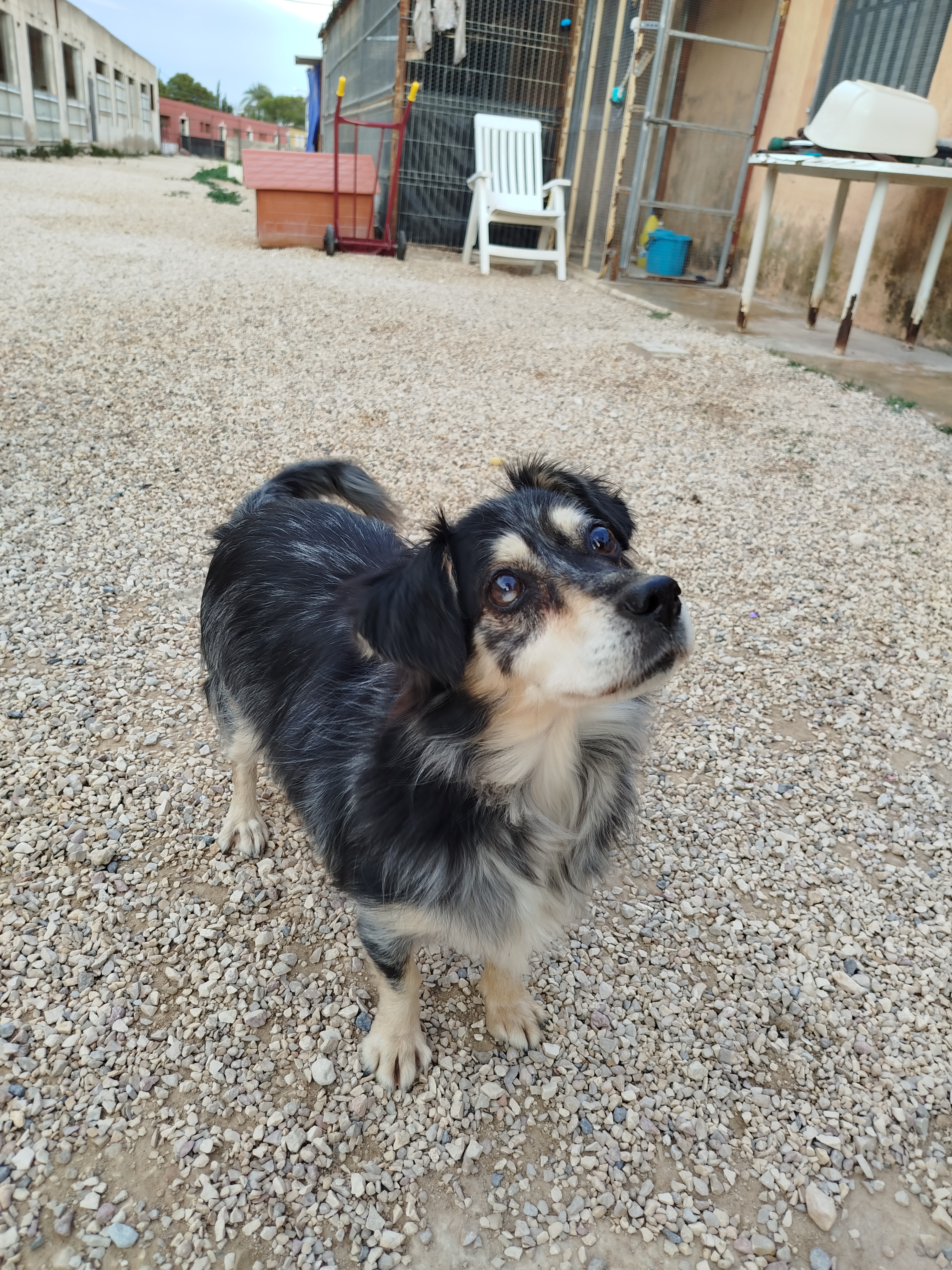 Este perro adulto es un mestizo de tamaño pequeño-mediano, con una expresión dulce y atenta que dice mucho de su carácter. Es un perro curioso, sociable y cariñoso, muy pendiente de las personas y con ganas constantes de interactuar.